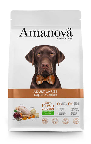 Deze super premium hondenvoeding is een voortreffelijk feestmaal voor uw volwassen hond. Het is rijk aan eiwitten, heeft een laag graangehalte en is gemaakt van alleen de meest verse, smakelijke kip. Deze heerlijk voedzame, 100% natuurlijke voeding is gemaakt in onze eigen keuken, bevat gezonde organische mineralen en is vrij van diermeel. Uw hond zal het verschil dat Amanova maakt waarderen.